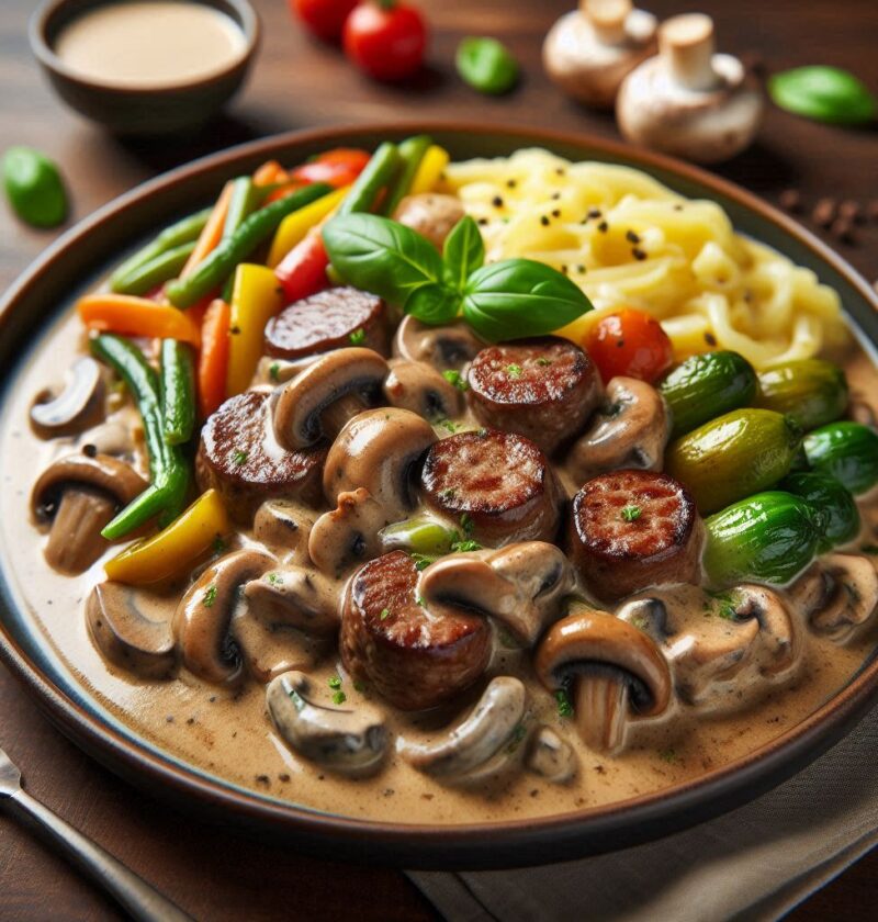 Vegetarisk korv stroganoff består av vegetarisk korv, lök, champinjoner, vitlök, tomatpuré och grädde som serveras över en bädd av ris, äggnudlar eller potatismos.