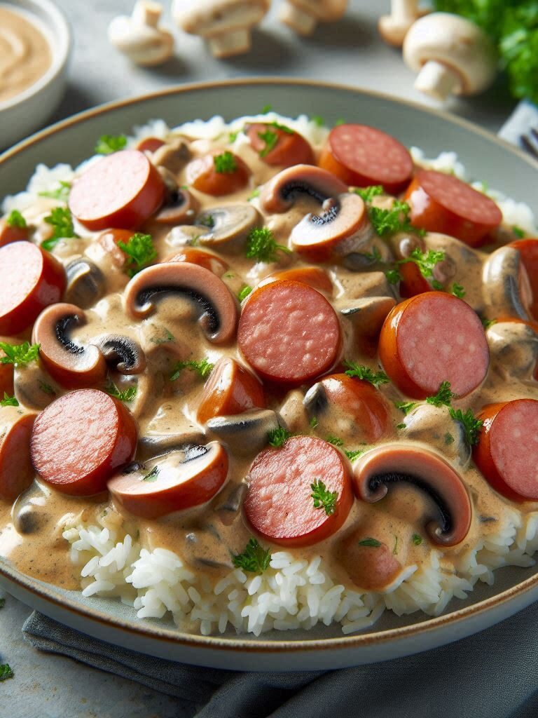 Korv stroganoff är en läcker, rejäl maträtt som är både lätt att göra och snabb att laga på 20 min. Det är en idealisk maträtt för upptagna kockar som vill njuta av en måltid utan att lägga ner för mycket tid i köket.