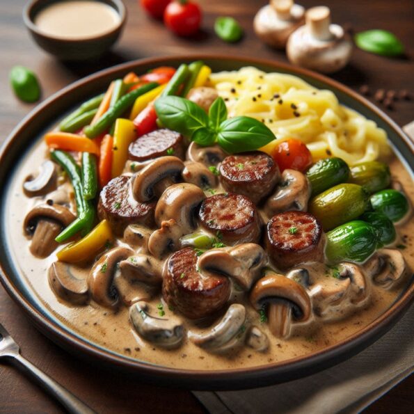 Vegansk korv stroganoff är en vegansk maträtt som består av vegansk korv som skärs i skivor och tillagas i en krämig sås med svamp, lök och vegansk gräddfil. Den är full av vitaminer, mineraler och andra viktiga näringsämnen som gör att du känner dig energisk och frisk.